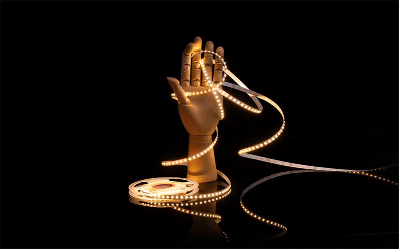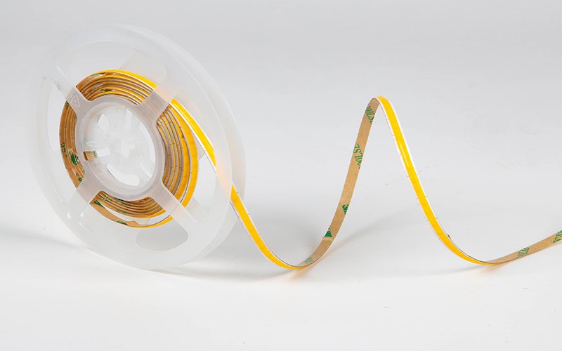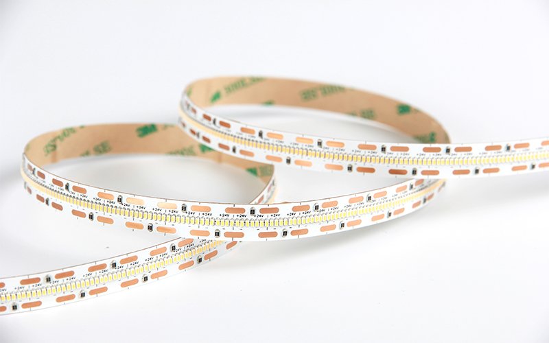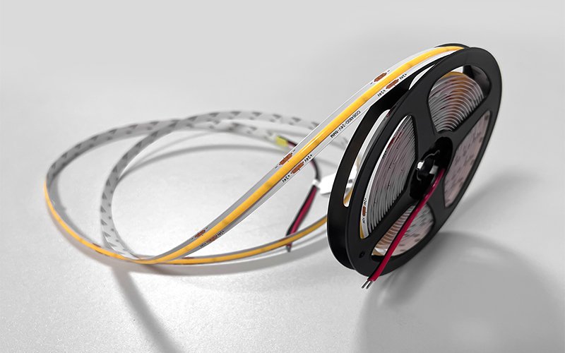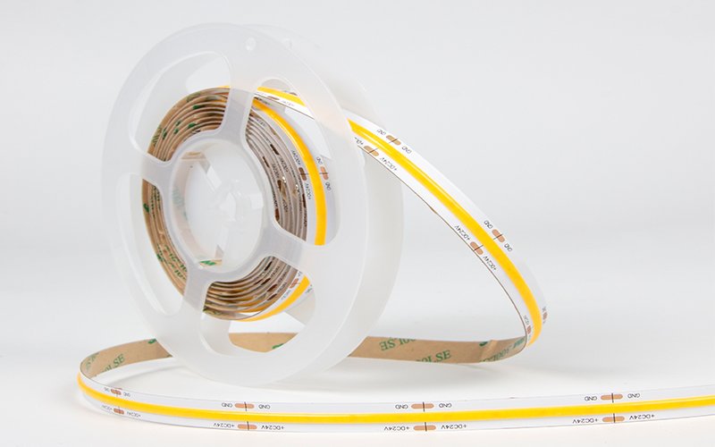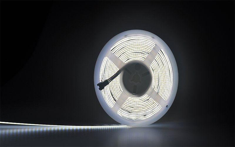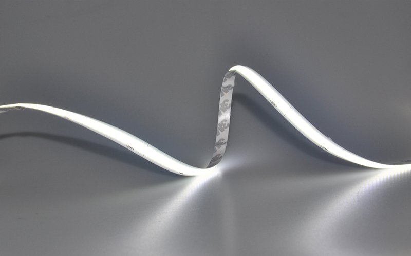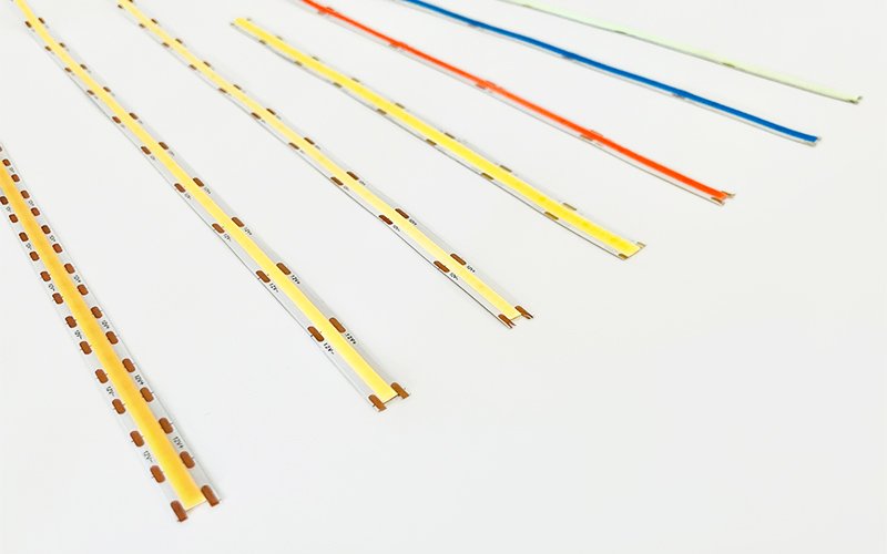 COB means Chips on Board, which means that the chips are directly encapsulated on the flexible PCB board, and the COB led strip is a strip of chips encapsulated on a flexible board. The chips are mostly flip-chips, which are linearly fixed on the PCB board, and then a layer of encapsulation glue mixed with phosphor is directly dropped on the surface of the chip. The light emitted from the chip is refracted, reflected, and interacts with the phosphor, and the glue emits different colors and color temperatures of light evenly. COB led strip is uniform, linear, and without light spots, stable and 180° beam angle.